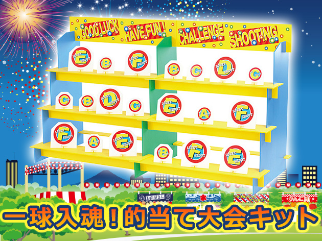 的当てゲ~ム!ストラックアウトにも似てますね。お祭りの定番ですね。皆さん一度はやりましたよね!? つい先日やったのですが、大人になっても面白いですね~ついつい本気になってしまいます(笑) くじ引きのような運任せとは違い、自分の腕次第で賞品ゲットが決まるのはいいですよね。子供も大はしゃぎするわけです。賞品も全てセットになっているのでおすすめですよ~♪