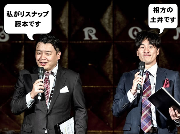 どうも、はじめまして、漫才コンビ、リスナップの藤本と申します。