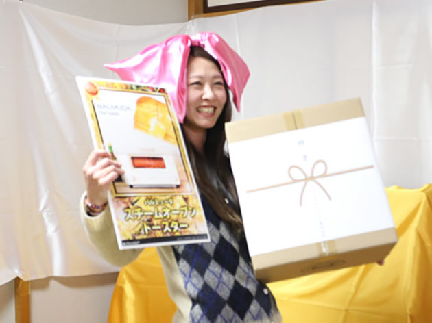 ビンゴ終了後にチケットの存在を伝え、景品を開けてもらいます。