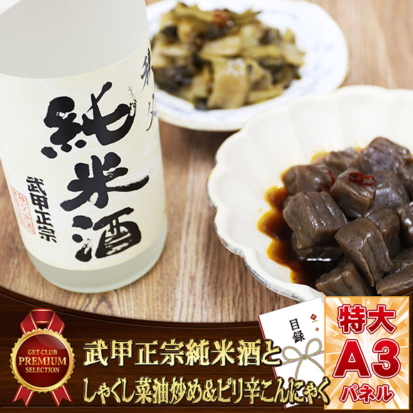 7. 秩父ちょい飲みセット 武甲正宗純米酒としゃくし菜油炒め&ピリ辛こんにゃく【目録引換券・A3パネル付き】
