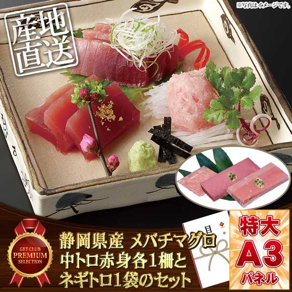 2 | 静岡県産 メバチマグロ中トロ赤身各1柵とネギトロ1袋のセット【目録引換券・A3パネル付き】 | 8000円 | 1個 | 8000円 |