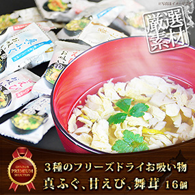 3 | 3種のフリーズドライお吸い物(真ふぐ、甘えび、まいたけ)16個セット 【目録引換券】 | 4500円 | 1個 | 4500円 |