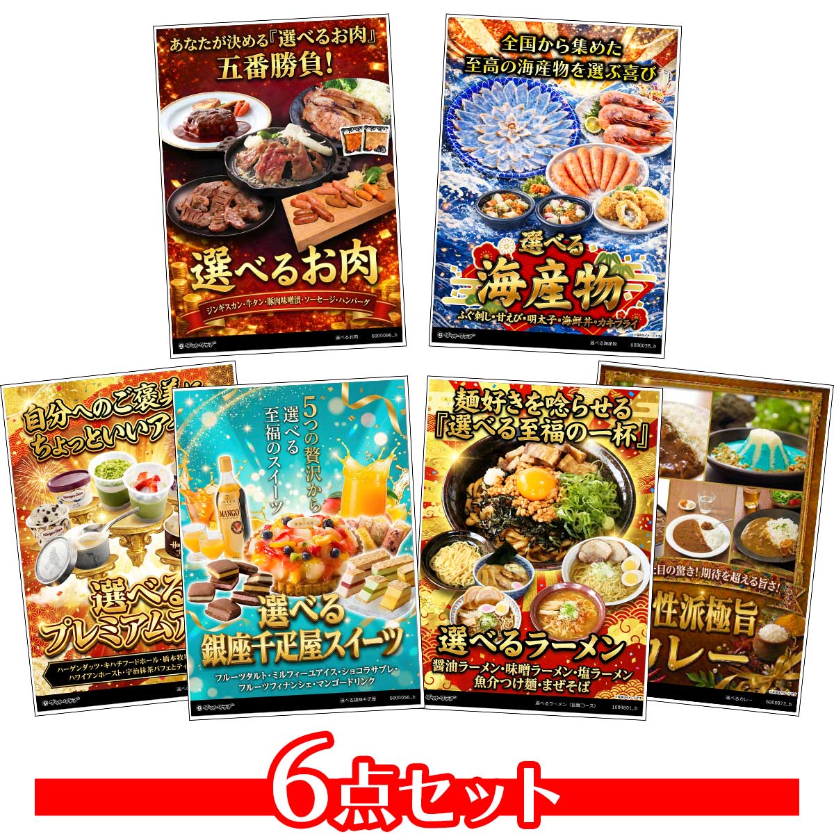 選べるグルメ目録景品6点セット A3パネル付き[海鮮・肉・アイス・丼・スイーツ・ラーメン]E00338,500 円(税込) -