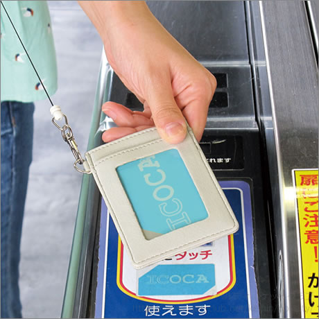 コードが伸びて楽々タッチ。表裏で2枚のカードを収納。