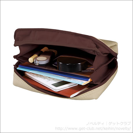ポーチの口が大きく開くから、中身の出し入れが簡単。でも仕切りがあるから横からはこぼれにくいスグレモノです。
