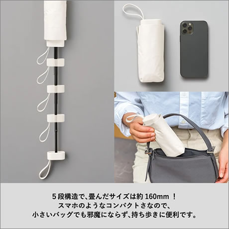 傘を畳んだ際には、約160mmとスマホのようなサイズ感で小さなバッグでも邪魔になりません。