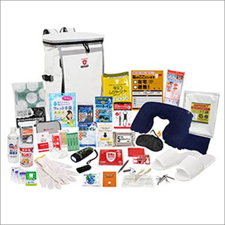 収納リュック・防災の心得・IDホイッスル&カラビナリング・カイロ・レインコート・携帯用トイレ・抗菌消臭簡易トイレ・トイレポンチョ・ダイナモマルチライト・モバイルバッテリー(乾電池式)・軍手・静音アルミブランケット・歯磨きシート1日分・ウェットティッシュ・衣類圧縮袋・スリッパ・ネックピロー・アイマスク・耳栓・レジャーシート・5年保存水500ml・カンパン・カトラリーセット・タッチペン・8徳ナイフ・給水袋3L・ソーイングセット・緊急避難カード・水に流せるペーパー・救急6点セット・ウェット手袋・45Lゴミ袋3P