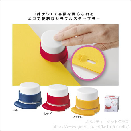 ハリを使わず、書類を綴じられるエコで便利なステープラーがシンプルカラーで勢ぞろい。配りものにも金属をつかわないため、ケガの心配がいりません。