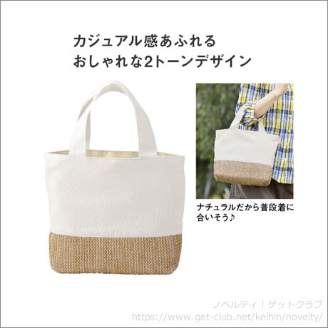 ナチュラルな2トーンカラーのバッグは、カジュアルなファッションにもよく似合います。近所へのお買い物や図書館、ペットの散歩にもぴったりのサイズ。