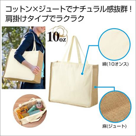 本体のコットンは軽やかな10オンス。サイドと底のマチをジュート素材が彩ります。