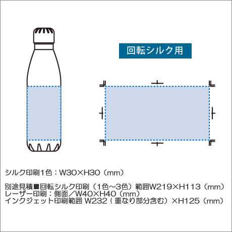 別途見積■回転シルク印刷(1色~3色)範囲 W219×H113(mm)、 レーザー印刷:側面/W40×H40(mm)、 インクジェット印刷範囲 W232 ( 重なり部分含む)×H125(mm) |