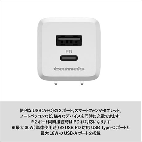 最大30W(単体使用時)のUSB PD対応USB Type-Cポートと最大18W(単体使用時)のUSB-Aポートを搭載しております。