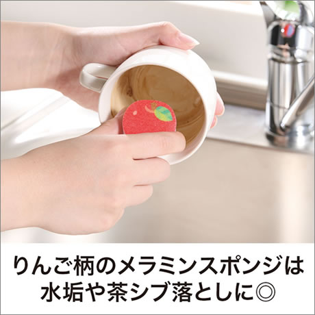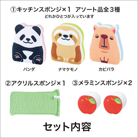 セット内容は、アニマルデザインのキッチンスポンジに加え、水だけで洗えるアクリルスポンジ1個と、リンゴのメラミンスポンジ2個を組み合わせた実用性の高いアソート。