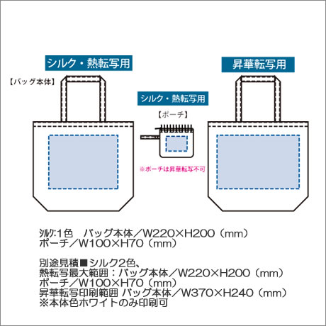 別途見積■シルク2色、熱転写最大範囲:バッグ本体/W220×H200(mm) ポーチ/W100×H70(mm) 昇華転写印刷範囲 バッグ本体/W370×H240(mm) ※本体色ホワイトのみ印刷可 |