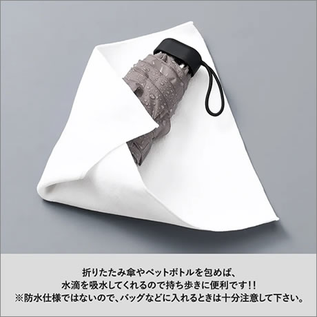 内側の生地は吸水力に優れており、折りたたみ傘やペットボトルを包めば