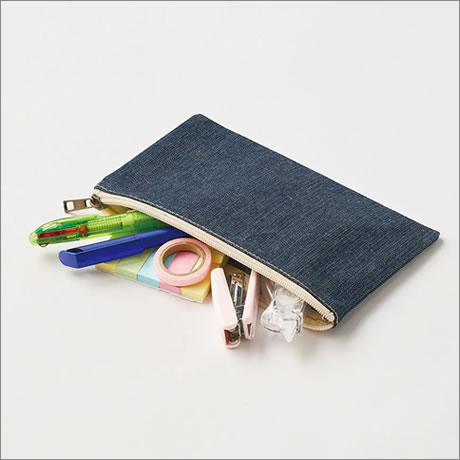フラットタイプで使いやすい、おしゃれな印象のデニムポーチです。