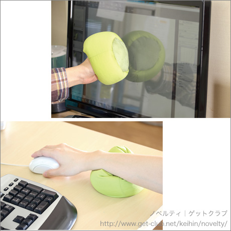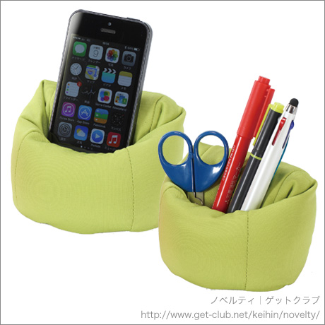 ビーズクッションのケータイスタンド。小物入れやリストレストとしても使えたり、底面のマイクロファイバーでディスプレイの拭き掃除もできます。