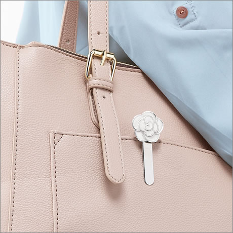 カギをスマートに取り出せる、アクセサリー感覚で使えるローズ型バッグリップです。