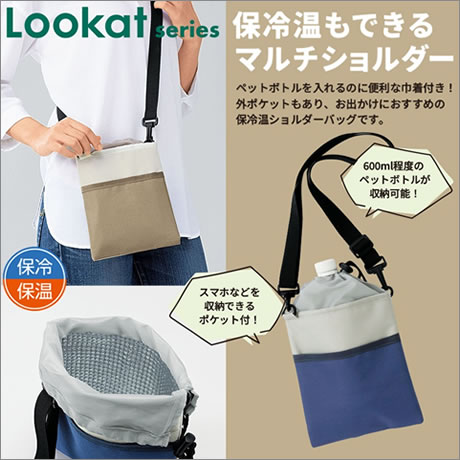 ペットボトルを入れるのに便利な巾着付き。外ポケットもあり、お出かけにおすすめの保冷温ショルダーバッグです。