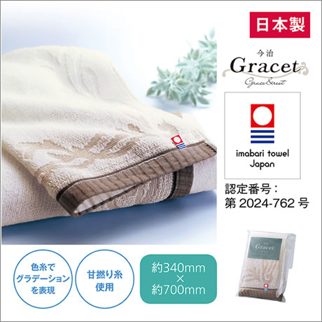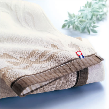 優雅なオーナメント柄が浮かぶ上品さと温かみのある色合いのふんわり柔らかな甘撚りタオル。