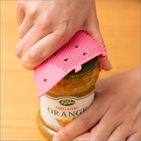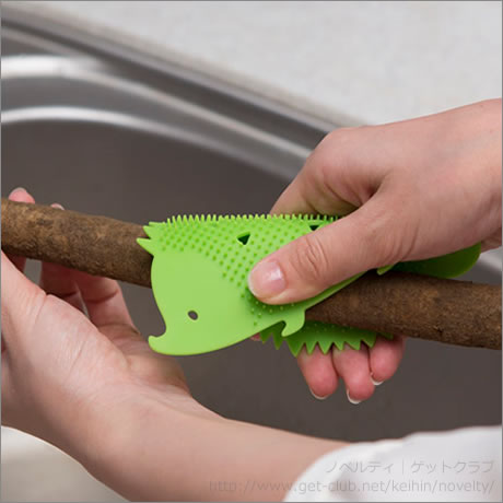 でこぼこした野菜や泥付き野菜が洗えます。ザル等の目の細かい道具のお掃除にもぴったり。開けにくいフタのオープナーにも便利。使い終わったらしっぽをフックに吊り下げて乾燥。