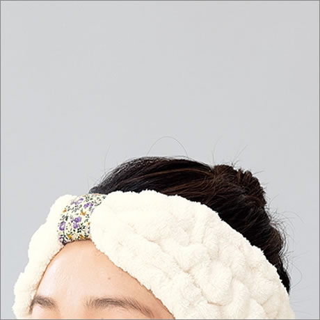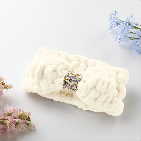 アクセントの小花模様とりぼん風フォルムがかわいいマイクロファイバー素材のヘアバンドです。