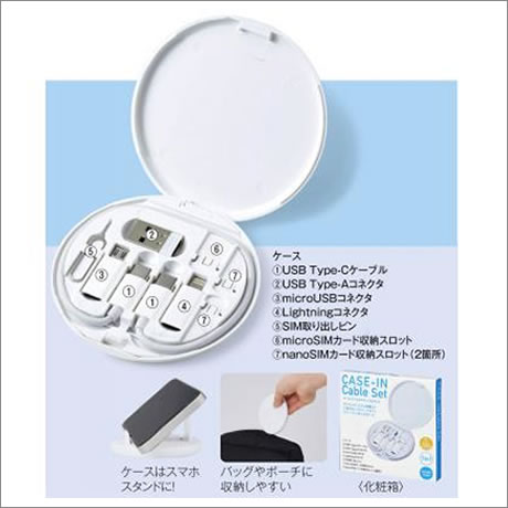 | 本体サイズ | ケース/直径8.3cm 厚さ1cm USB Type-Cケーブル/全長約29cm USB Type-Aコネクタ/1.2×2×0.5cm microUSBコネクタ/1.1×2.6×0.5cm Lightningコネクタ/1.1×2.6×0.5cm SIM取り出しピン/0.7×0.1×3.3cm |