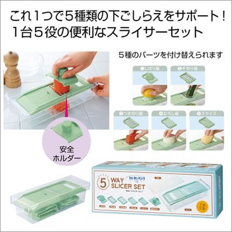 <セット内容> ・しぼり器×1 ・おろし器×1 ・つま切り器×1 ・スライス×1 ・千切り器×1 ・安全ホルダー×1