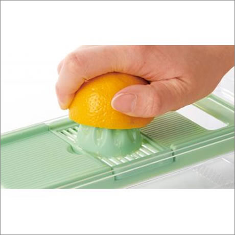 しぼり器/おろし器/つま切り器/スライス/千切り それぞれに適したアタッチメントに付け替えて使用します。指をケガしない安全ホルダー付き。キッチンになじむグリーンカラーがさわやかです。