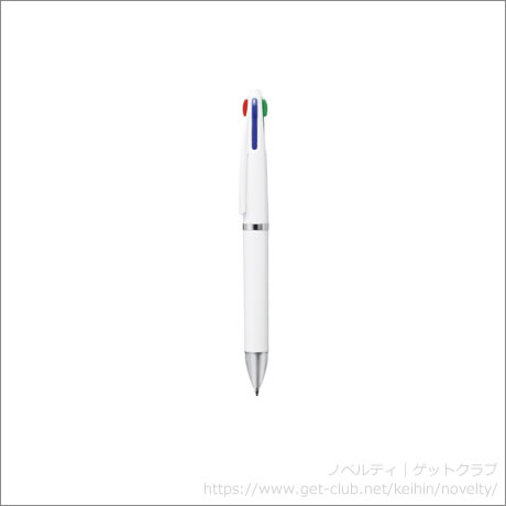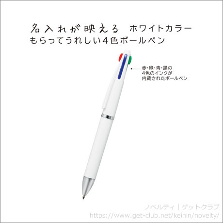 赤、青、緑、黒の4色のインクが使えるボールペンは、ビジネス向けにも学生向けにもノベルティとして名入れが映えるホワイトボディを採用しています。握りやすい太さがずっと使ってもらえる、もらって嬉しい筆記具です。
