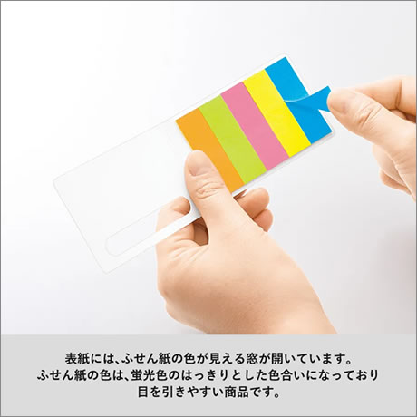 表紙は窓付きで、はっきりとした蛍光色のふせん紙が見えるデザインです。