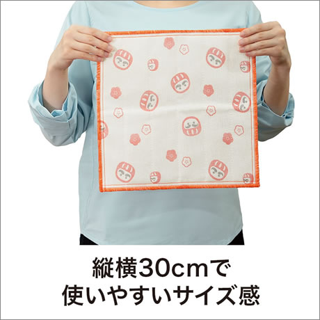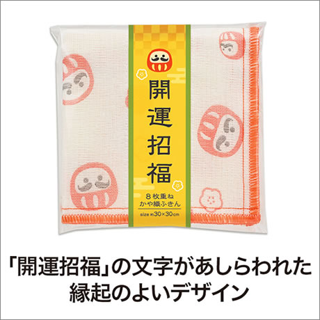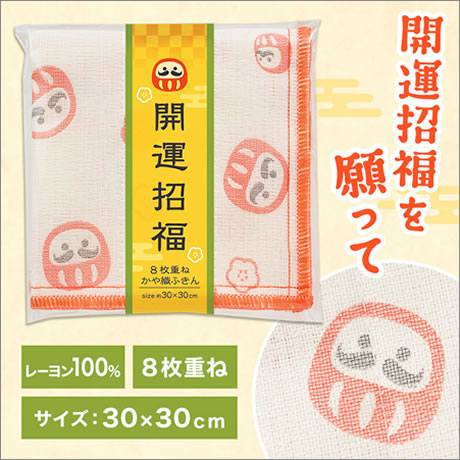 縁起の良いだるま柄をあしらった「開運招福」シリーズのかや織ふきんです。
