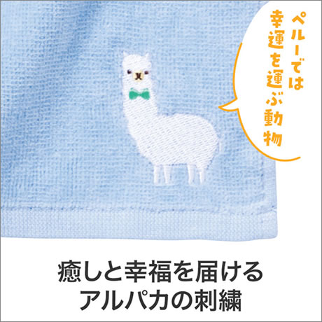 ふんわりとした手触りと、かわいいアルパカの刺繍が魅力。