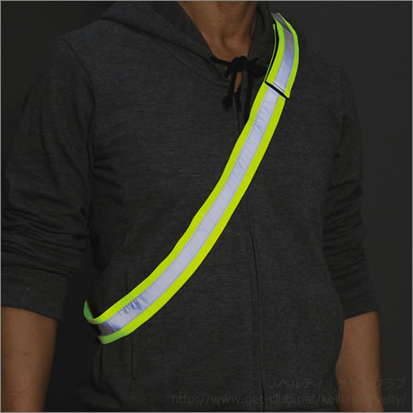 車のライトを強力に反射するたすきです。夜道のウォーキングや自転車の運転に!