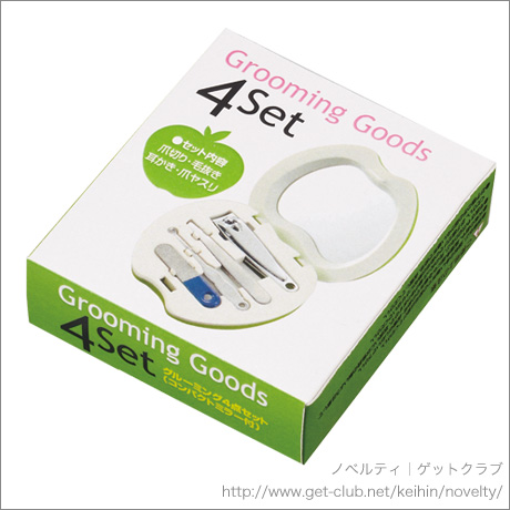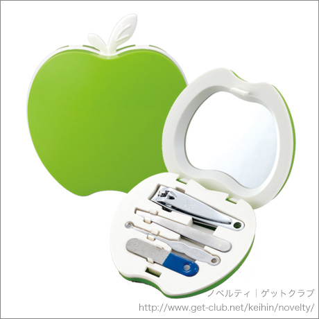 身だしなみを整えるグルーミング4点を、コンパクトミラーのついたリンゴの形のケースにセットしました。