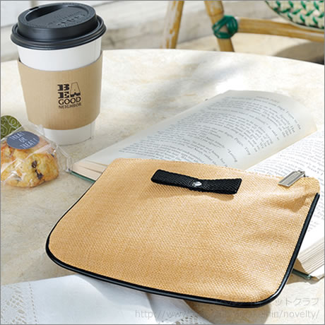 シンプルなフラットリボンがアクセント。 内側はお手入れカンタンな撥水加工です(完全防水ではありません)。 ちょっと男前なジュート風素材が今の気分