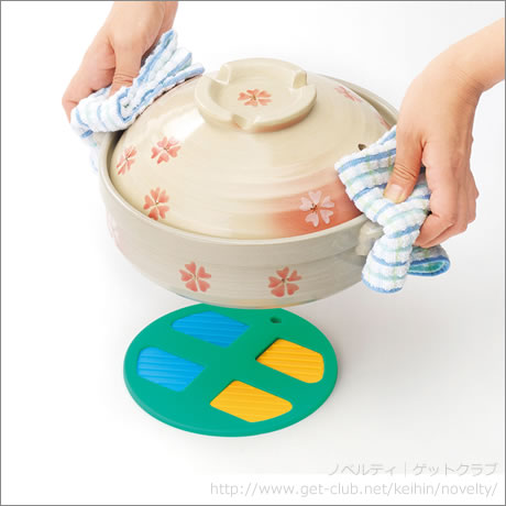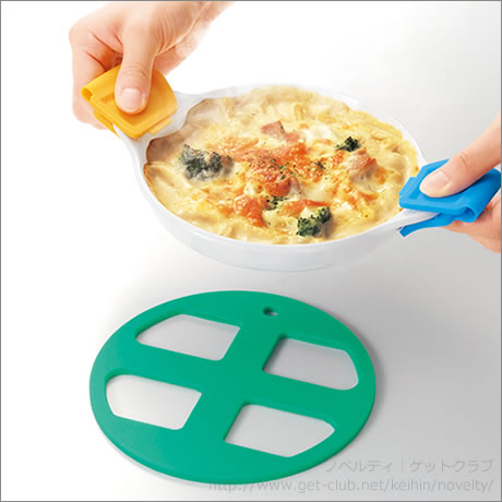 お鍋やグラタンなどのあつあつ料理に欠かせない鍋敷きとトングが一体化!さっと使いたい時に便利な逸品です。 鍋敷きとトングが合体、便利なマット!