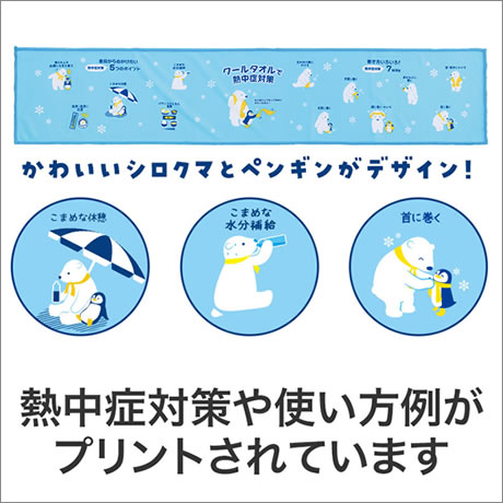 本体にデザインされたイラストのしろくまくんとペンギンちゃんが、クールタオルの使い方や、熱中症予防策のポイントを教えてくれます。