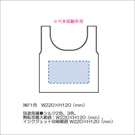 別途見積■シルク2色、3色、熱転写最大範囲:W220×H120(mm)、インクジェット印刷範囲 W220×H120(mm) |