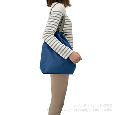 ヒモを絞って巾着になるユニークなトート スポーツやレジャーに活躍しそう。