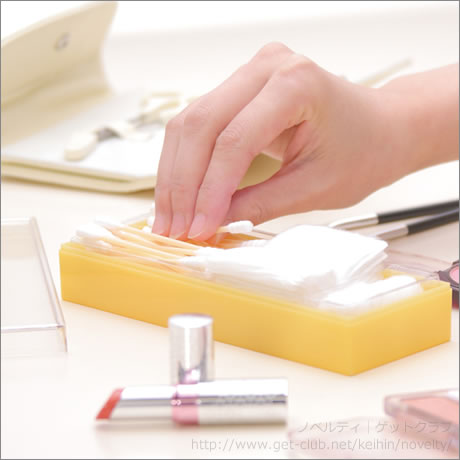整頓されたコスメ用品は、キレイをつくる基本。化粧台に置いて便利で清潔に使えるかわいいカラーのケース付。もちろんホコリを防げるフタ付です。