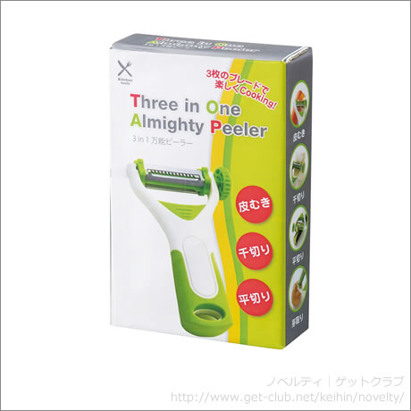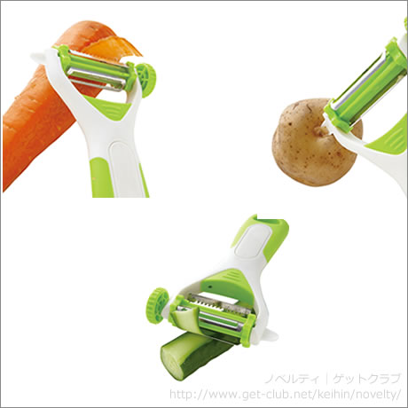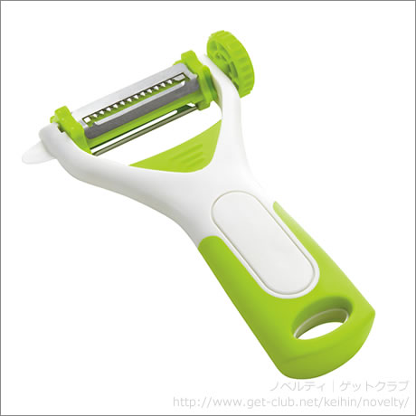 皮むき、千切り、薄切りの3つの機能がこれ一つに備わっています。もちろん、サイドにはじゃがいもの芽取り付き。ハンドル部分には滑り止め加工もついています。キッチンの名脇役!