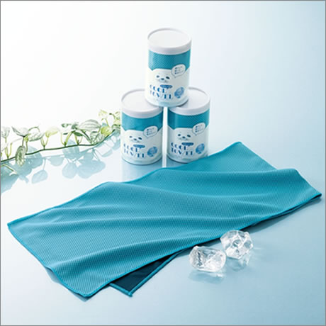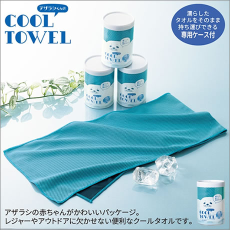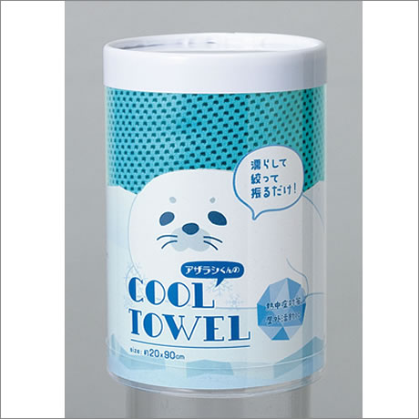 アザラシの赤ちゃんがかわいいパッケージ。レジャーやアウトドアに欠かせない便利なクールタオルです。