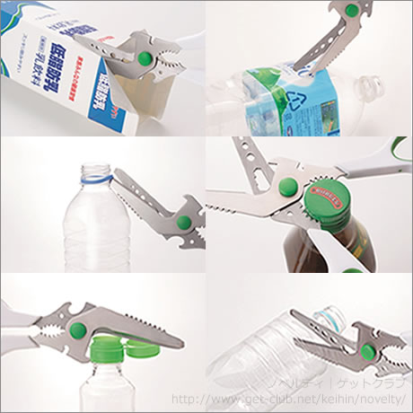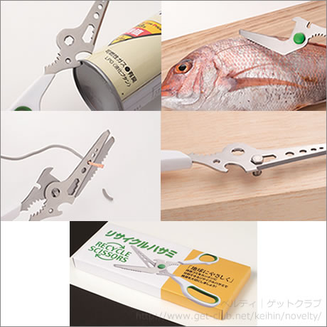 分別に便利な10通りの機能を持つリサイクルハサミ。牛乳パックの解体、ラベルカット、キャップリングカット、キャップ開け、注ぎ口キャップ外し、ペットボトルカット、電線のシールド剥ぎ、ガス抜き(穴開け)、魚のウロコ取り、六角ネジ外し。