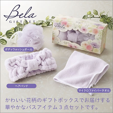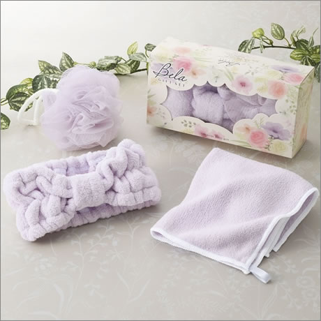 | 本体サイズ | ヘアバンド:約20×10㎝ タオル:約30×30㎝ボディウォッシュボール:約φ10㎝ |