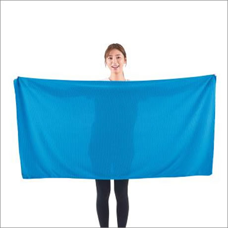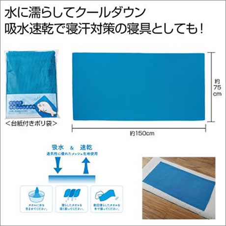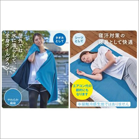 大判の涼感シーツタオル。屋外では水に濡らして全身クールダウン、室内では布団の上に敷いて寝汗対策に!