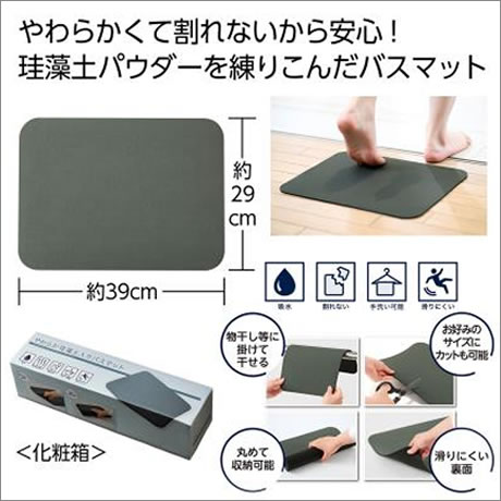 珪藻土パウダーを使用した、吸水の良いマット。これまでの珪藻土バスマットとは違って割れる心配がなく、手洗いもできていつでも気持ちよく使えます。