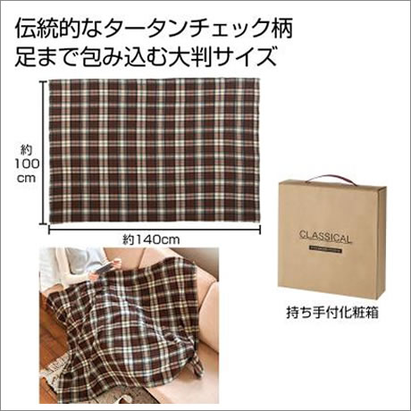 リラックスタイムに肩から羽織ったりもできる大きめサイズ。チェック柄は使う人を選ばずどんなシーンにもマッチするため喜ばれます。