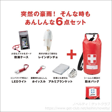 レインポンチョに防滴スマホケース、コンパクトで明るいLEDライト、居場所を知らせるホイッスルに、防寒にも便利なアルミブランケットをシームレス構造の防水バッグとセットにしました。突然の豪雨や災害時の備えにあんしん6点セット