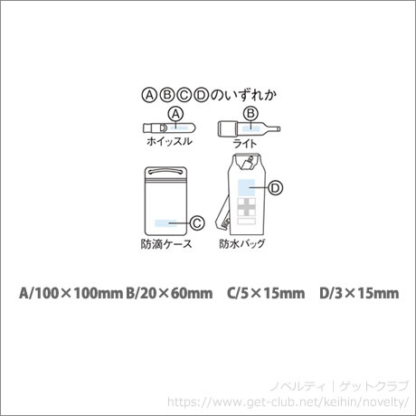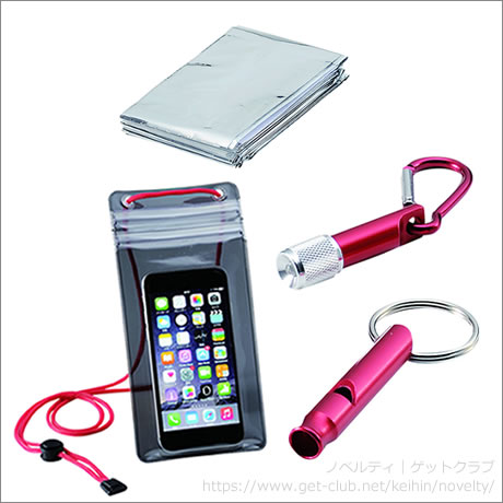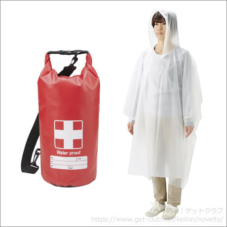 セット内容/防水バッグ・アルミブランケット・防滴ケース・LEDライト・ホイッスル・レインポンチョ、ライト/LED1灯式、ボタン電池4個付 材質:アルミブランケット/アルミニウム・PET、防水バッグ・防滴ケース/PVC、LEDライト・ホイッスル/アルミニウム、レインポンチョ/ポリエチレンビニルアセテート
